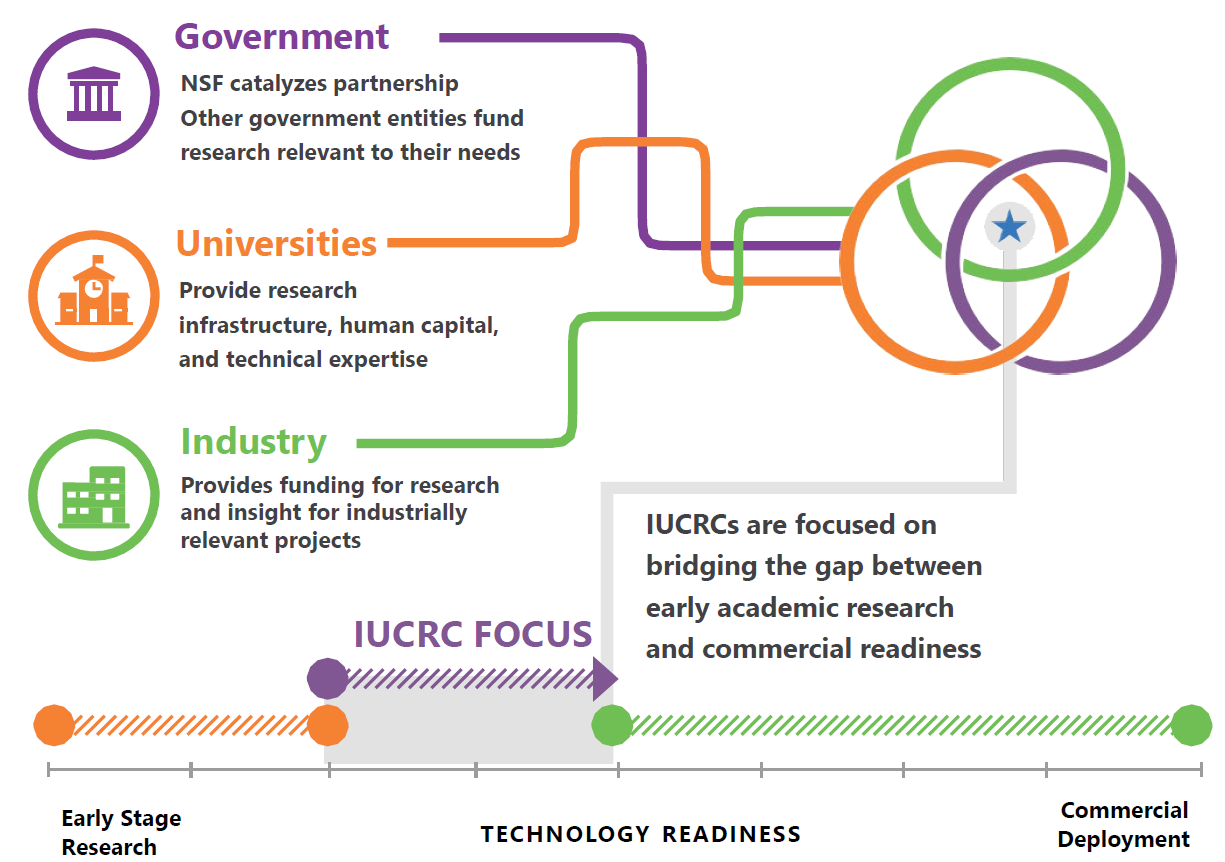 Through annual membership, partners collectively shape the research roadmap, prioritize and select projects, and guide technology translation pathways from early-stage concepts toward validated prototypes and system-level demonstrations (TRL 3–6). The IUCRC framework enables members to collectively envision and fund research in a shared-cost, highly cost-efficient innovation model that offers early access to knowledge, facilities, technical talent, and intellectual property, while building a highly skilled workforce pipeline and a sustainable long-term innovation ecosystem.